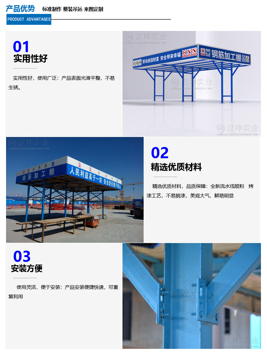 | 产品用途: | 中间双立柱加工棚用于施工现场钢筋、木工等班组的加工防护作用 |